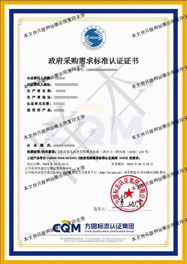 為加強對方圓自愿性產(chǎn)品認(rèn)證標(biāo)志的管理,確保產(chǎn)品認(rèn)證標(biāo)志的正確使用,維護產(chǎn)品認(rèn)證標(biāo)志的權(quán)威性和CQM的信譽,方圓標(biāo)志認(rèn)證集團依據(jù)國家認(rèn)證認(rèn)可的相關(guān)要求制定了產(chǎn)品認(rèn)證標(biāo)志使用規(guī)范。標(biāo)志基本樣式: